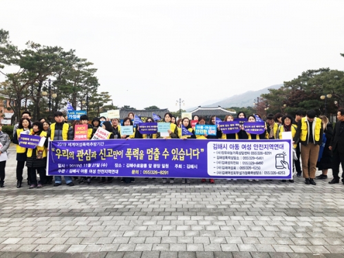 | ±èÇØ½Ã ¾Æµ¿¤ý¿©¼º¾ÈÀüÁö¿ª¿¬´ë´Â ¼¼°è¿©¼ºÆø·ÂÃß¹æÁÖ°£À» ¸Â¾Æ 27ÀÏ ¿ÀÈÄ ¼ö·Î¿Õ¸ª ±¤Àå¿¡¼ ±èÇØ½Ã ¾Æµ¿¤ý¿©¼º¾ÈÀüÁö¿ª¿¬´ë ¼Ò¼Ó °¡Á¤Æø·Â»ó´ã¼Ò, ¼ºÆø·Â»ó´ã¼Ò, °æÂû¼, ÀÚ¿øºÀ»çÀÚ µî 50¿©¸íÀº ¹°¸®Àû ÆøÇàÀ» ³Ñ¾î ÀÜÀÎÇÏ°í ´Ù¾çÇÑ ÇüÅ·Π¿©¼ºµéÀÇ »îÀ» ÆÄ±«½ÃŰ´Â Æø·ÂÀ» ¿¹¹æÇϰíÀÚ ÁÖÀ§ÀÇ ÀÎ½Ä º¯È¿Í °ü½ÉÀ» Ã˱¸ÇÏ´Â Ä·ÆäÀÎÀ» Çß´Ù. /Â÷ȯ½Ä ±âÀÚ |