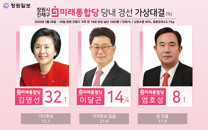 ¹Ì·¡ÅëÇÕ´ç ÁøÇر¸ ±¹È¸ÀÇ¿øÈĺ¸ ¼±Ãâ ´ç³»°æ¼±¿¡¼ ¸¸¾à ´ÙÀ½ È帵éÀÌ ´ë°áÇÑ´Ù¸é ´©±¸¸¦ ´õ ÁöÁöÇϽðڴÀ³Ä´Â Áú¹®¿¡ ¡ã±è¿µ¼± 32.1% ¡ãÀÌ´Þ°ï 14.4% ¡ã¾öÈ£¼º 8.1% ¡ã±âŸ 12.1% ¡ãÁöÁöÈĺ¸ ¾øÀ½ 21.6% ¡ãÀß ¸ð¸§ 11.9% ·Î Á¶»çµÆ´Ù.