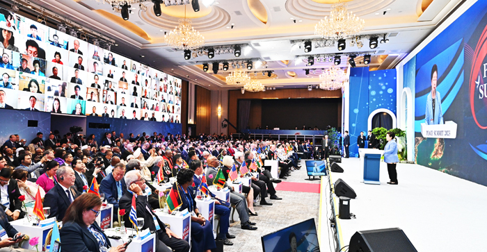 À±¿µÈ£ Çǽº¼¹Ô °øµ¿Á¶Á÷À§¿øÀåÀº °³È¸»ç¿¡¼ ¡°°øµ¿Ã¢¼³ÀÚ ¡®ÆòÈÀÇ ¾î¸Ó´Ï¡¯ ÇÑÇÐÀÚ ÃÑÀç´Â ¡®Çϳª´Ô¡¯À» ¡®Çϴúθð´Ô¡¯À¸·Î ¸ð½Ã´Â ¡®Àηù ÇÑ °¡Á·¡¯ ÀÌ»ó°ú ½ÅÅëÀϼ¼°èÀÇ ºñÀüÀ» ÁÖâÇßÀ¸¸ç, ÆòȺñÀüÀ» ½ÇÇöÇϱâ À§ÇØ ±¹°¡´ÜÀ§ ¿ùµå¼¹Ô ÇÁ·ÎÁ§Æ®¿Í Àü ¼¼°è Áö½ÄÀεéÀÇ ¿¬´ëüÀÎ ¡®THINK TANK 2022¡¯¸¦ ½Ã¸®Áî·Î °³ÃÖÇØ ¿Ô´Ù¡±¸é¼, ¡°Áö³ÇØ ³²ºÏ°øµ¿¼ö±³±¹°¡ 157°³ ±¹°¡¿Í ¿¬´ëÇØ °³ÃÖµÈ Çѹݵµ Æòȼ¹Ô¿¡¼ äÅÃÇÑ ¡®¼¿ï¼±¾ð¡¯Àº ¡®ÇϳªÀÇ Áö±¸, ÇϳªÀÇ Àηù, ÇϳªÀÇ ¹®È¡¯¶ó´Â ¸ðƼºê·Î ¡®ÆòÈÇåÀ塯(Universal Peace Charter)À̶ó´Â À̸§À¸·Î Á¤¸³µÇ¾î Ç×±¸Àû Æòȼ¼°è ½ÇÇöÀÇ »ç»óÀû Åä´ë¸¦ ¸¶·ÃÇß´Ù¡±°í ¹àÇû´Ù.