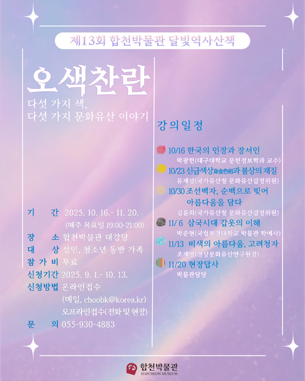 ¿ÃÇØ´Â `¿À»öÂù¶õ ´Ù¼¸ °¡Áö »ö, ´Ù¼¸ °¡Áö ¹®ÈÀ¯»ê À̾߱â`¸¦ ÁÖÁ¦·Î Çѱ¹ ¹®ÈÀ¯»ê ¼Ó ´Ù¼¸ °¡Áö »öÀ» Áß½ÉÀ¸·Î ¿ª»ç¤ý¹Ì¼ú¤ý°í°íÇÐ ºÐ¾ß Àü¹®°¡µéÀÌ °¿¬À» ÆîÄ¡¸ç »öÀ» ¸Å°³·Î ¹®ÈÀ¯»êÀÇ Àǹ̸¦ »õ·Ó°Ô Á¶¸íÇÑ´Ù.