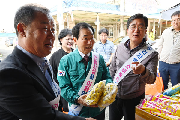 ¼º³«ÀΠâ³ç±º¼ö°¡ Áö³ 9¿ù 30ÀÏ ¿µ»ê½ÃÀåÀ» ¹æ¹®ÇØ Ãß¼®¸ÂÀÌ ÀüÅë½ÃÀå À庸±â Çà»ç¸¦ Âü¼®Çϸç ÀüÅë½ÃÀå ¼Ò»ó°øÀΰú ÀÚ¿µ¾÷ÀÚµéÀ» °Ý·ÁÇß´Ù. |
