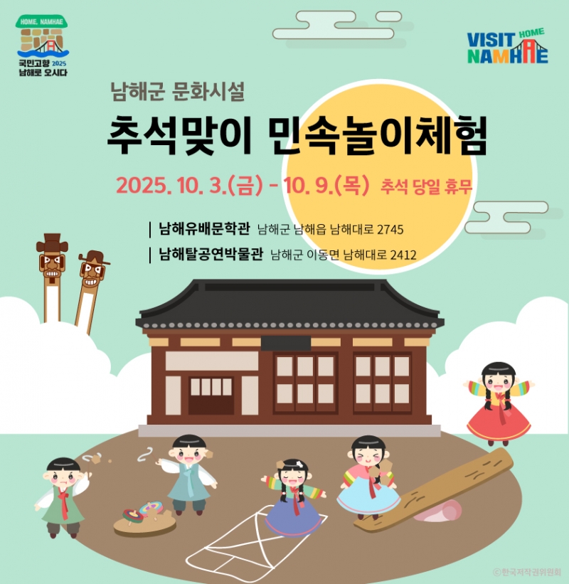 À̹ø Ãß¼® ¿¬ÈÞ(10.3.~10.9.)¿¡´Â Ãß¼® ´çÀÏ(10.6.)À» Á¦¿ÜÇÑ Àü ¿¬ÈÞ ±â°£ µ¿¾È ³²ÇØÀ¯¹è¹®Çаü, ³²ÇØÅ»°ø¿¬¹Ú¹°°ü, ¹Ù·¡±æÀÛÀº¹Ì¼ú°ü(³²Çرº ³²¸é ³²¸é·Î1739¹ø±æ 46), ¹ÂÁö¾ö³²ÇØ(³²Çرº â¼±¸é ¿¬°î·Î 13) µî °ü³» ¹®È½Ã¼³µéÀÌ ¸ðµÎ Á¤»ó¿î¿µµÈ´Ù. º¸¹°¼¶½Ã³×¸¶(³²Çرº ³²ÇØÀ¾ ¼±¼Ò·Î 12)´Â Ãß¼® ´çÀÏ¿¡µµ ¼Õ´ÔÀ» ¸ÂÀ» ¿¹Á¤ÀÌ´Ù.