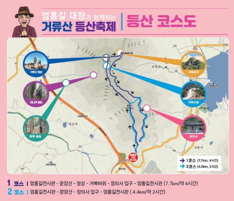 ¸ÕÀú °Å·ù»ê Á¤»ó ÄÚ½º(7.7§°, ¾à 4½Ã°£ ¼Ò¿ä)´Â ¾öÈ«±æ Àü½Ã°üÀ» Ãâ¹ßÇØ °Å·ù»ê Á¤»ó(571.7m)¿¡ ¿À¸£°í °ÅºÏ¹ÙÀ§¿Í ÀåÀǻ縦 °æÀ¯ÇØ Ãâ¹ßÁ¡À¸·Î µ¹¾Æ¿À´Â ÄÚ½º´Ù.