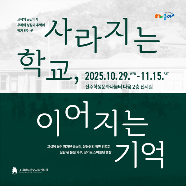 ÁøÁÖ±³À°Áö¿øÃ»Àº 29ÀϺÎÅÍ ¿À´Â 11¿ù 15ÀϱîÁö ÁøÁÖÇлý¹®È³ª´®ÅÍ ´Ù¿ò 2Ãþ Àü½Ã½Ç¿¡¼ 2025³â ÇϹݱ⠱âȹÀü½Ã `»ç¶óÁö´Â Çб³, À̾îÁö´Â ±â¾ï`À» °³ÃÖÇÑ´Ù.