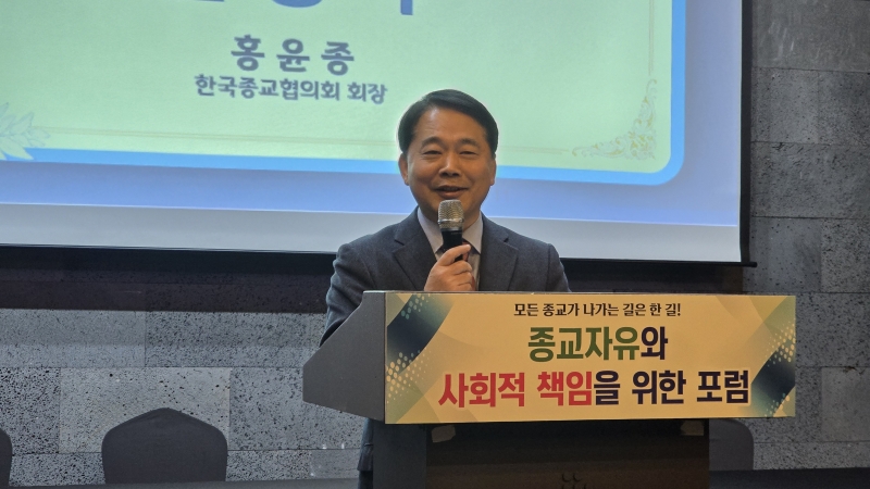 | Á¾±³ÀÇ ÀÚÀ¯¿Í »çȸÀû Ã¥ÀÓÀ» À§ÇÑ Æ÷·³¿¡¼ ȯ¿µ»ç¸¦ ÇÏ´Â È«À±Á¾ Çѱ¹Á¾±³ÇùÀÇȸ ȸÀå. |