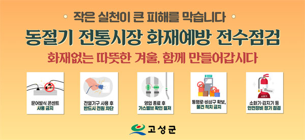 °í¼º±ºÀº Áö³ 2ÀÏ µ¿Àý±â¸¦ ¸Â¾Æ ÀüÅë½ÃÀå ³» ÈÀ翹¹æ¤ý¾ÈÀü»ç°í ¹æÁö¸¦ À§ÇØ ¼Ò¹æ, Àü±â, °¡½ººÐ¾ß¿¡ ´ëÇÑ Àü¼ö Á¡°ËÀ» ½ÃÇàÇß´Ù.