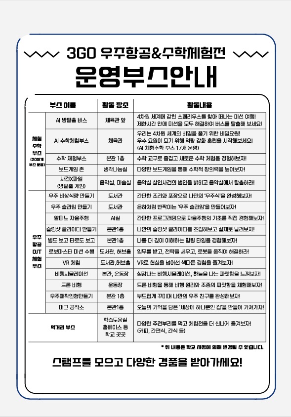 `¼öÇÐÀ¸·Î ¹è¿ìGO, ¿ìÁÖ·Î ³ª¾Æ°¡GO, ¹Ì·¡¸¦ ¿GO`¶ó´Â ½½·Î°Ç ¾Æ·¡ ¿¸®´Â À̹ø üÇèÀüÀº AI, ¿ìÁÖÇ×°ø, ¼öÇÐ, VR µî ¹Ì·¡ ÇÙ½É ±â¼úÀ» ÇÑÀÚ¸®¿¡¼ °æÇèÇÒ ¼ö ÀÖµµ·Ï ±¸¼ºµÆ´Ù.