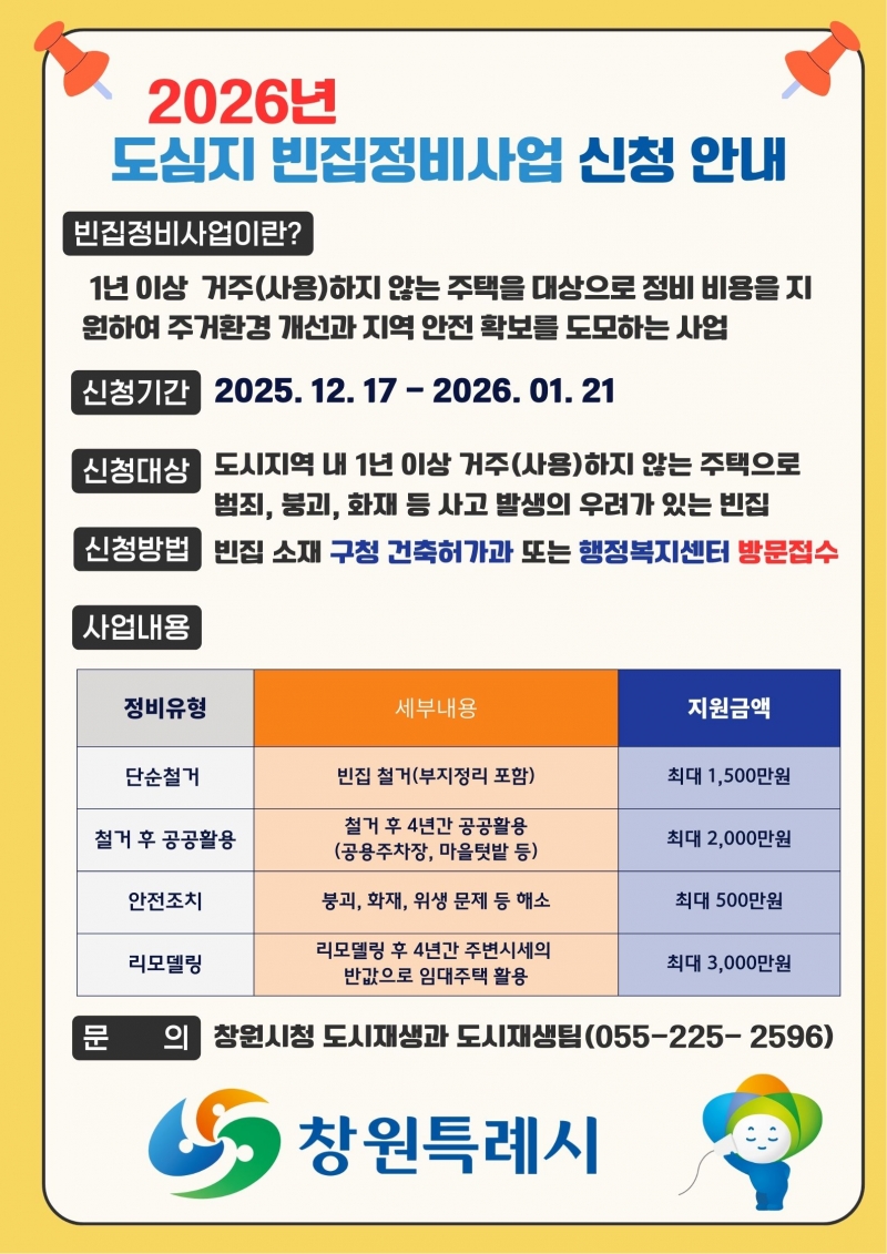 ½Åû ±â°£Àº 17ÀϺÎÅÍ 2026³â 1¿ù 21ÀϱîÁöÀ̸ç Á¤ºñ¸¦ Èñ¸ÁÇÏ´Â ºóÁý ¼ÒÀçÁö ±¸Ã» °ÇÃàÇã°¡°ú ¹× ÇàÁ¤º¹Áö¼¾ÅÍ¿¡ ¹æ¹® ½ÅûÇÏ¸é µÈ´Ù.