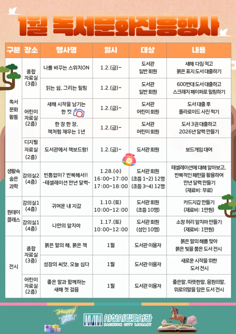 »çõ½Ã¸³µµ¼°üÀº 2026³â »õÇØ¸¦ ¸Â¾Æ ½Ã¹ÎµéÀÌ Ã¥À» ÅëÇØ ÇÑ ÇØÀÇ Ã¹°ÉÀ½À» ÀÇ¹Ì ÀÖ°Ô ³»µó°í °¡Á·°ú ÇÔ²²ÇÏ´Â ¹®ÈÀû ¿©À¯¸¦ Áñ±æ ¼ö ÀÖµµ·Ï 1¿ù ÇÑ ´Þ°£ ´Ù¾çÇÑ µ¶¼¹®ÈÁøÈïÇà»ç¸¦ ¿î¿µÇÑ´Ù.