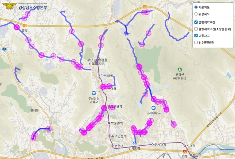 ¼Ò¹æº»ºÎ ºÐ¼® °á°ú, °æ³² Àü¿ªÀÇ °áºùÃë¾à±¸°£Àº ÃÑ 379°³ ±¸°£(633.41§°)¿¡ À̸¥´Ù.