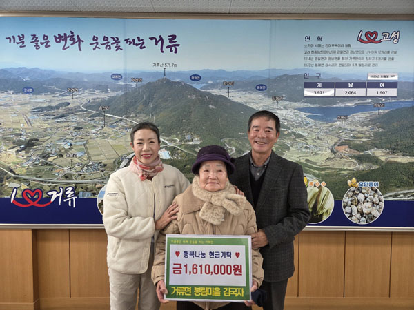 | °í¼º±º °Å·ù¸é ºÀ¸²¸¶À»¿¡ °ÅÁÖÇÏ´Â ±è±¹ÀÚ ÇÒ¸Ó´Ï´Â ÀÚ³àµé°ú ÇÔ²² °Å·ù¸é»ç¹«¼Ò¸¦ ¹æ¹®ÇØ Áö¿ªÀÇ ¼Ò¿ÜµÈ ÀÌ¿ô¿¡ µûµíÇÑ ¿ÂÁ¤ÀÇ ¼Õ±æÀ» Àü´ÞÇØ ´Þ¶ó¸ç ¼º±Ý 161¸¸¿øÀ» ±âŹÇß´Ù. |