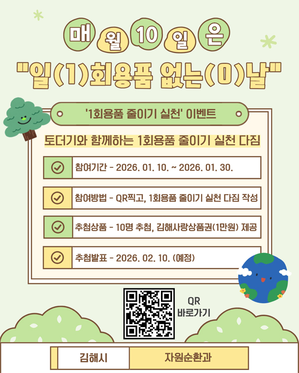 ±èÇØ½Ã °ø½Ä SNS¿¡¼ ÀÚ¿ø¼øÈ¯ Á¤Ã¥°ú 1ȸ¿ëǰ ÁÙÀ̱⠽Çõ ¹æ¹ýÀ» ¼Ò°³Çϰí, ÄûÁî Âü¿©ÀÚ Áß 10¸íÀ» ÃßÃ·ÇØ ±èÇØ»ç¶û»óǰ±Ç ¶Ç´Â ģȯ°æ Á¦Ç°À» Á¦°øÇÑ´Ù. ´ç÷Àڴ ¦¼ö ´Þ 10ÀÏ ½Ã SNS¿¡¼ ¹ßÇ¥ÇÑ´Ù.