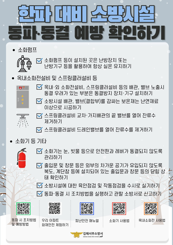 °Ü¿ïö ±â¿ÂÀÌ ±Þ°ÝÈ÷ ¶³¾îÁú °æ¿ì ¼ÒÈÆßÇÁ, ¿Á³»¼ÒÈÀü, ½ºÇÁ¸µÅ¬·¯¼³ºñ µî ¼Ò¹æ½Ã¼³ÀÌ µ¿°áµÇ°Å³ª ÆÄ¼ÕµÅ ÈÀç ¹ß»ý ½Ã Á¤»ó ÀÛµ¿ÀÌ ¾î·Á¿öÁú ¼ö ÀÖ¾î, »çÀü Á¡°Ë°ú °ü¸®ÀÇ Á߿伺ÀÌ ´õ¿í Ä¿Áö°í ÀÖ´Ù.