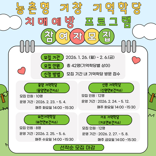 Âü¿© ´ë»óÀº ¸¸ 60¼¼ ÀÌ»ó Áö¿ª ÁÖ¹ÎÀ¸·Î ¸ðÁý ±â°£Àº 26ÀϺÎÅÍ ¿À´Â 2¿ù 6ÀϱîÁöÀÌ¸ç ¼±Âø¼øÀ¸·Î Á¢¼öÇÑ´Ù. Âü¿©¸¦ Èñ¸ÁÇÏ´Â ÁÖ¹ÎÀº °¡±î¿î ±â¾ïÇд翡 ¹æ¹® ½ÅûÇÏ¸é µÇ°í ÇÁ·Î±×·¥ °ü·ÃµÈ ÀÚ¼¼ÇÑ »çÇ×Àº Ä¡¸Å¾È½É¼¾ÅÍ(055-940-7910) ¶Ç´Â ±â¾ïÇд纰·Î ¹®ÀÇÇÏ¸é ¾È³»¹ÞÀ» ¼ö ÀÖ´Ù.