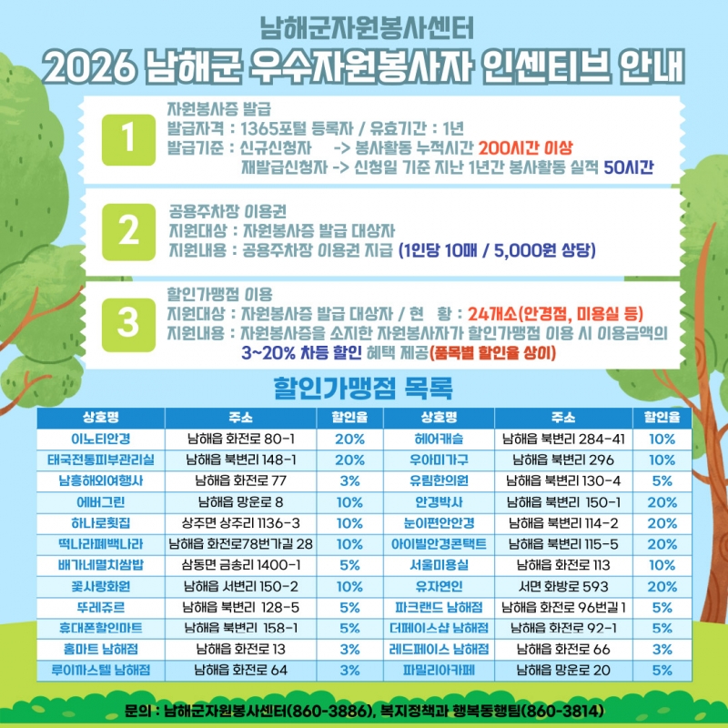 ³²ÇرºÀº ÀÚ¿øºÀ»ç Âü¿© Ȱ¼ºÈ¿Í Áö¼ÓÀûÀÎ Âü¿©¸¦ À¯µµÇϱâ À§ÇØ ¿¬Áß ¿î¿µ ÁßÀÎ ³²Çرº ¿ì¼öÀÚ¿øºÀ»çÀÚ Àμ¾Æ¼ºê Á¦µµÀÇ ÇýÅÃÀ» È®´ëÇϰíÀÚ °ü³» ÇÒÀΰ¡¸ÍÁ¡ 4°³¼Ò¸¦ Ãß°¡Çß´Ù°í ¹àÇû´Ù.
