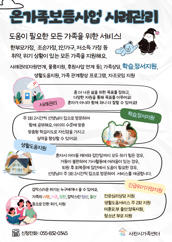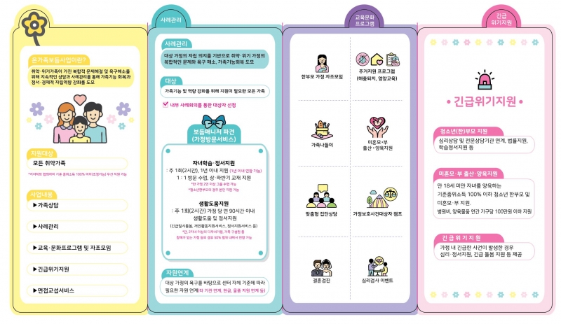»ç·Ê°ü¸®¸¦ ÅëÇØ ÀÚ³à ÇнÀ¤ýÁ¤¼ Áö¿ø, ÀÏ»ó»ýȰ µµ¿ò ¼ºñ½º µîÀÌ ÇÔ²² Á¦°øµÇ¸ç ÇÊ¿ä ½Ã ¹°Ç°Áö¿ø, ÀÇ·áºñ, ±³À°ºñ, ±ä±Þ »ý°èºñ Áö¿ø µî ´Ù¾çÇÑ ¿ÜºÎÀÚ¿øÀ» ¿¬°èÇØ °¡Á·ÀÌ ´õ ³ªÀº ÀÏ»óÀ» ȸº¹ÇÒ ¼ö ÀÖµµ·Ï µ½´Â´Ù.