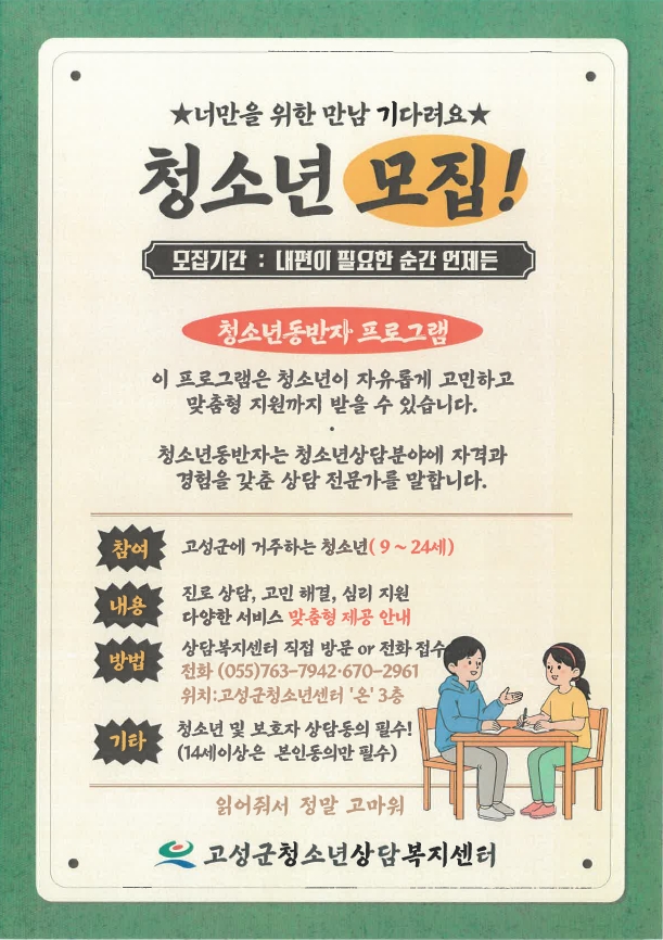 °í¼º±ºÀÌ ¿î¿µÇÏ´Â °í¼º±ºÃ»¼Ò³â»ó´ãº¹Áö¼¾ÅÍ´Â Áö³ 26ÀϺÎÅÍ ¿À´Â 2¿ù 13ÀϱîÁö °í¼ºÀ¾ °ü³»ÀÇ Ã»¼Ò³â¿ì´ë°¡°Ô¿Í ÆíÀÇÁ¡ µî û¼Ò³â ÃâÀÔÀÌ ÀæÀ» °ÍÀ¸·Î ¿¹»óµÇ´Â °÷À» ¹æ¹®ÇØ `û¼Ò³âµ¿¹ÝÀÚ ÇÁ·Î±×·¥ ´ë»óÀÚ ¸ðÁý ¾È³»¹®` ºÎÂø È«º¸È°µ¿À» ½Ç½ÃÇÑ´Ù°í ¹àÇû´Ù.