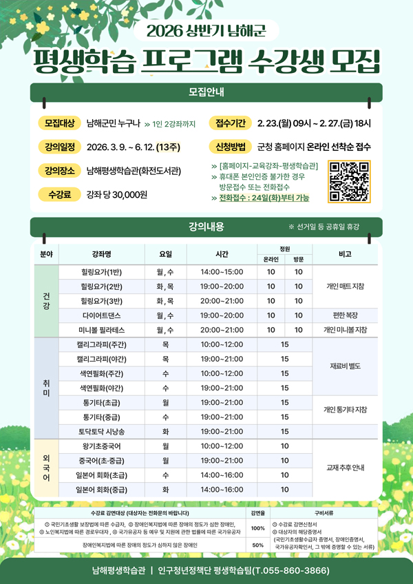 ÇÁ·Î±×·¥ ½Åû ¹× ¿î¿µ¿¡ °üÇÑ ÀÚ¼¼ÇÑ »çÇ×Àº ³²ÇرºÃ» ȨÆäÀÌÁö ¶Ç´Â ³²ÇØÆò»ýÇнÀ°ü ÀüÈ(055-860-3866)À» ÅëÇØ ¾È³»¹ÞÀ» ¼ö ÀÖ´Ù.