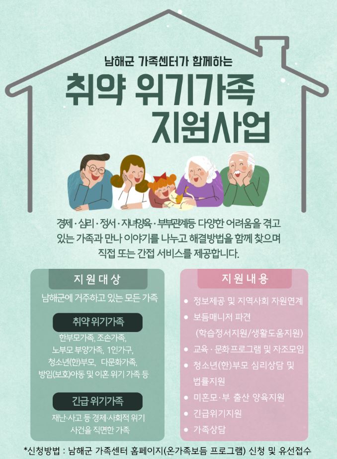 Áö¿ø ´ë»óÀº ³²Çرº¿¡ °ÅÁÖÇÏ´Â ÇѺθð°¡Á¤, Á¶¼Õ°¡Á¤, û¼Ò³â(ÇÑ)ºÎ¸ð°¡Á·, ´Ù¹®È°¡Á·, 1Àΰ¡±¸, ³ëºÎ¸ð ºÎ¾ç°¡Á¤ µîÀ» ºñ·ÔÇØ µ¹º½ °ø¹éÀ̳ª À糤ý»ç°í, ÀÌÈ¥ À§±â µî °©ÀÛ½º·¯¿î À§±â »óȲÀ» °Þ´Â °¡Á¤ÀÌ´Ù.