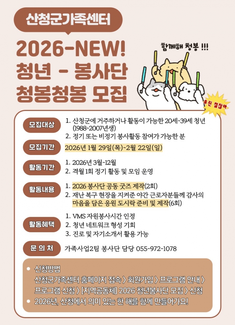 û³âºÀ»ç´Ü ¸ðÁý ´ë»óÀº 20~39¼¼(1988~2007³â) û³âÀ¸·Î Áö¿ª»çȸ ºÀ»çȰµ¿¿¡ °ü½É Àִ û³âÀÌ¸é ´©±¸³ª ½ÅûÇÒ ¼ö ÀÖ´Ù.