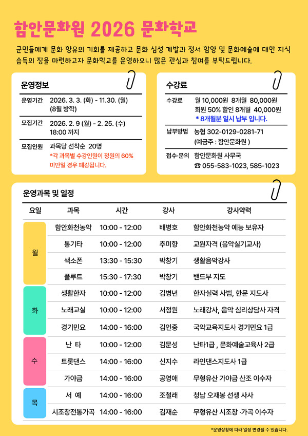 ÇԾȹ®È¿øÀº ±º¹Îµé¿¡°Ô ¹®È ÇâÀ¯ ±âȸ Á¦°øÇϰí, ¹®È ½É¼º °è¹ß°ú Á¤¼ ÇÔ¾ç¤ý¹®È¿¹¼ú¿¡ ´ëÇÑ Áö½Ä ½ÀµæÀÇ ÀåÀ» ¸¶·ÃÇϰíÀÚ 2026³â ¹®ÈÇб³ ¼ö°»ýÀ» ¿À´Â 25ÀϱîÁö ¼±Âø¼øÀ¸·Î ¸ðÁýÇÑ´Ù°í ¹àÇû´Ù.