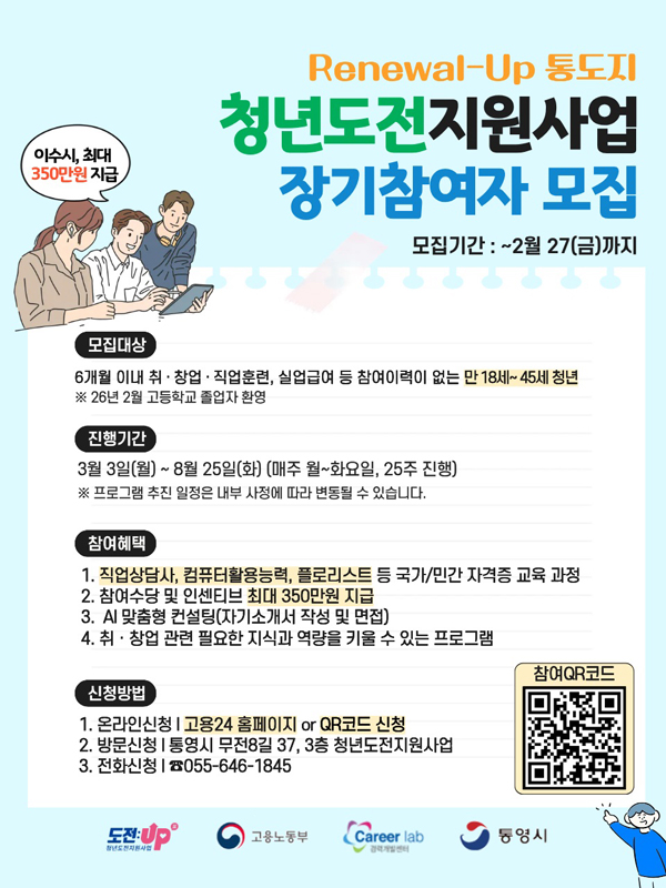 û³âµµÀüÁö¿ø»ç¾÷Àº ÃÖ±Ù 6°³¿ù ÀÌ»ó Ãë¾÷À̳ª ±³À°¤ýÁ÷¾÷ÈÆ·Ã ÀÌ·ÂÀÌ ¾ø´Â ¸¸ 18~45¼¼ û³â ´ë»ó ¸ÂÃãÇü ÇÁ·Î±×·¥À» Á¦°øÇØ ±¸Á÷ ÀÇ¿åÀ» °íÃëÇÏ´Â »ç¾÷À¸·Î À̹ø Àå±â°úÁ¤Àº ÃÑ 25ÁÖ°£ ÁøÇàµÇ¸ç ÇÁ·Î±×·¥À» ¼º½ÇÈ÷ À̼öÇÑ Âü¿©ÀÚ¿¡°Ô´Â ÃÖ´ë 350¸¸¿øÀÇ Âü¿©¼ö´ç°ú Àμ¾Æ¼ºê¸¦ Áö±ÞÇØ °æÁ¦Àû ÀÚ¸³À» Áö¿øÇÑ´Ù.