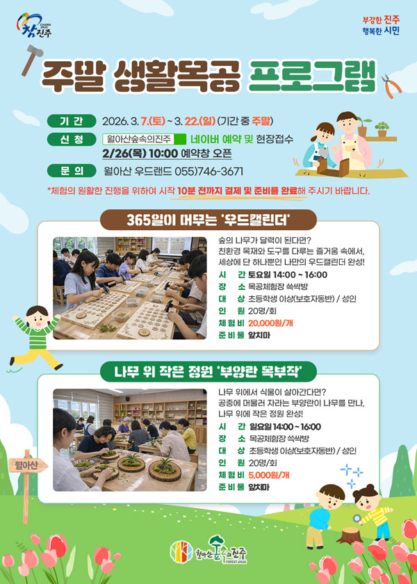 ¸ÕÀú ¿À´Â 3¿ù 7ÀϺÎÅÍ 22ÀϱîÁö ÁÖ¸»¸¶´Ù `ÁÖ¸» »ýȰ¸ñ°ø`À» ¿î¿µÇϸç, `365ÀÏÀÌ ¸Ó¹«´Â ¿ìµå ͏°´õ(wood calendar)`¿Í `³ª¹« À§ ÀÛÀº Á¤¿ø, ºÎ¾ç¶õ ¸ñºÎÀÛ`À» ¼±º¸ÀδÙ.