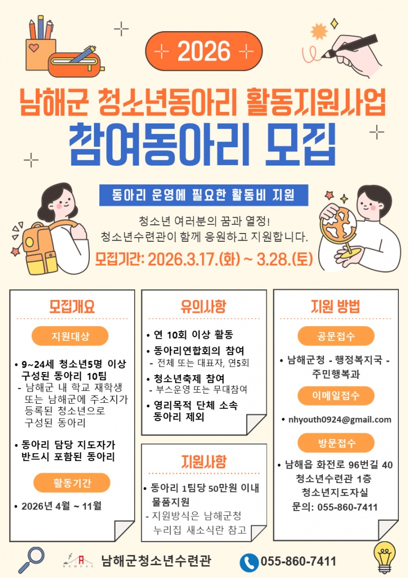 Áö¿ø ´ë»óÀº ³²Çرº ³» Çб³¿¡ ÀçÇÐ ÁßÀ̰ųª ³²Çرº ³» ÁÖ¼Ò°¡ µî·ÏµÈ 9~24¼¼ û¼Ò³â 5¸í ÀÌ»ó°ú ÁöµµÀÚ 1¸íÀ¸·Î ±¸¼ºµÈ µ¿¾Æ¸®·Î ¿¬Áß 10ȸ ÀÌ»ó ÀÚü Ȱµ¿À» ¿î¿µÇÏ°í µ¿¾Æ¸® ¿¬ÇÕȸ ¹× û¼Ò³âÃàÁ¦ µî¿¡ Âü¿©ÇÒ ¼ö ÀÖ¾î¾ß ÇÑ´Ù.