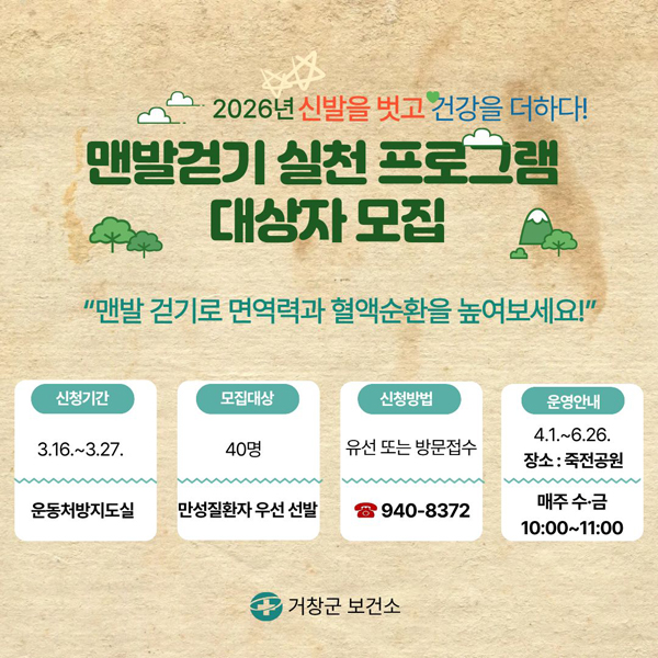 ÀÌÁ¤Çå º¸°Ç¼ÒÀåÀº "¸Ç¹ß°È±â´Â ¹ß¹Ù´Ú ÀÚ±ØÀ» ÅëÇØ Ç÷¾×¼øÈ¯ °³¼±°ú ½ºÆ®·¹½º ¿ÏÈ µî °Ç° ÁõÁø¿¡ µµ¿òÀ» ÁÙ ¼ö ÀÖ´Â »ýȰ ¼Ó ½ÅüȰµ¿"À̶ó¸ç "ÁֹεéÀÌ ÀÚ¿¬ ¼Ó¿¡¼ ¸Ç¹ß·Î °È´Â Áñ°Å¿òÀ» ´À³¢´Â ±âȸ°¡ µÇ±æ ¹Ù¶õ´Ù"°í ¸»Çß´Ù.