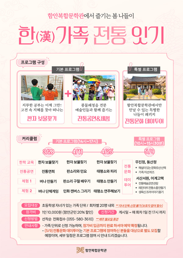 ÇԾȱºÀº 28ÀϺÎÅÍ ¿À´Â 5¿ù 9ÀϱîÁö ÇԾȺ¹ÇÕ¹®Çаü¿¡¼ ÃʵîÇлý Àڳฦ µÐ °¡Á·À» ´ë»óÀ¸·Î ¿ì¸® ÀüÅë¹®ÈÀÇ °¡Ä¡¸¦ Á÷Á¢ üÇèÇÏ°í ¹è¿ì´Â `ÇÑ(ùÓ)°¡Á· ÀüÅë ÀÕ±â` ÇÁ·Î±×·¥À» ¿î¿µÇÑ´Ù°í 15ÀÏ ¹àÇû´Ù.