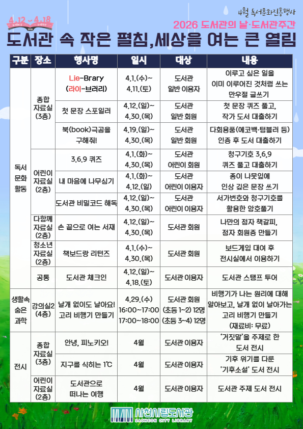 »çõ½Ã¸³µµ¼°üÀº 4¿ù µµ¼°üÀÇ ³¯ ¹× µµ¼°ü ÁÖ°£À» ¸Â¾Æ µµ¼°üÀ» º¸´Ù Ä£¼÷ÇÏ°Ô ÀÌ¿ëÇϰí Ã¥°ú ÇÔ²²ÇÏ´Â Áñ°Å¿òÀ» ´À³¥ ¼ö ÀÖµµ·Ï `4¿ù µ¶¼¹®ÈÁøÈïÇà»ç`¸¦ ¿î¿µÇÑ´Ù.