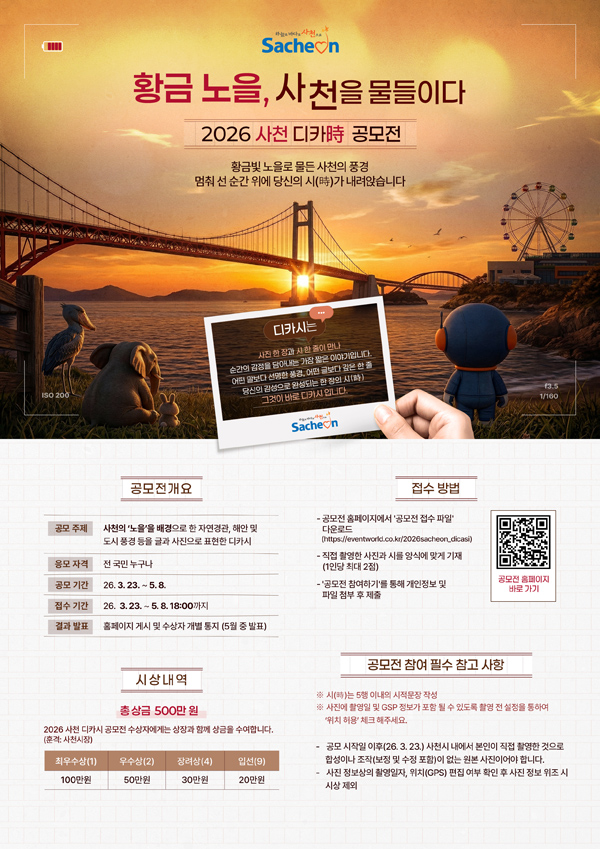 »çõ½Ã´Â Áö¿ªÀ» ´ëÇ¥ÇÏ´Â °ü±¤ÀÚ¿øÀÎ `³ëÀ»`À» ÁÖÁ¦·Î ÇÑ `2026 »çõ µðÄ«½Ã °ø¸ðÀü`À» °³ÃÖÇϰí, ¿À´Â 5¿ù 8ÀϱîÁö Àü ±¹¹ÎÀ» ´ë»óÀ¸·Î ÀÛǰÀ» Á¢¼öÇÑ´Ù.