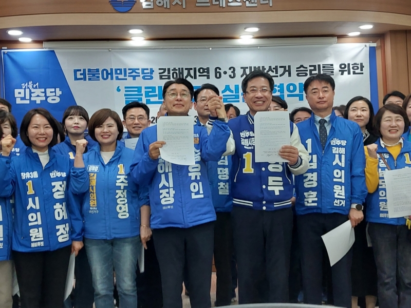 6.3 Áö¹æ¼±°Å¿¡ Ã⸶ÇÏ´Â ´õºÒ¾î¹ÎÁÖ´ç ±èÇØÁö¿ª ¿¹ºñÈ帵éÀÌ 30ÀÏ ¿ÀÀü ±èÇØ½Ãû ÇÁ·¹½º¼¾ÅÍ¿¡¼ Çù¾à½ÄÀ» ÇÏ°í ½Ã¹Î ¾Õ¿¡ ºÎ²ô·´Áö ¾ÊÀº `Ŭ¸° °æ¼±`À» Ä¡¸£°Ú´Ù°í ¾à¼ÓÇß´Ù.