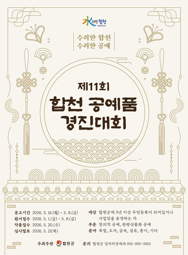 ÇÕõ±ºÀº Áö³ 3¿ù 16ÀÏÀÚ °ø°í¸¦ ÅëÇØ Áö¿ª ³» °ø¿¹ÀεéÀÇ ±â·®À» ÆîÄ¥ Á¦11ȸ ÇÕõ °ø¿¹Ç° °æÁø´ëȸ¸¦ °³ÃÖÇÑ´Ù°í ¾Ë¸®¸ç, Áö¿ª °ø¿¹ÀεéÀÇ Âü¿©¸¦ µ¶·ÁÇϰíÀÚ È«º¸¿¡ ³ª¼¹´Ù°í 2ÀÏ ¹àÇû´Ù.