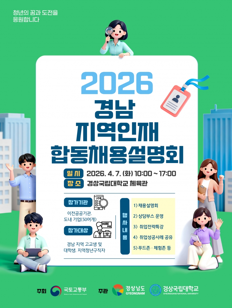 À̳¯ ¿ÀÀü 10½ÃºÎÅÍ ¿ÀÈÄ 5½Ã±îÁö üÀ°°ü¿¡¼ °æ³² Çõ½Åµµ½Ã 10°³ ±â°ü, ¿ï»ê Çõ½Åµµ½Ã 5°³ ±â°üÀ» Æ÷ÇÔÇØ 55°³ ±â°ü(¾÷)ÀÌ Ã¤¿ë»ó´ã ºÎ½º¸¦ ¿î¿µÇÏ°í °æ»ó±¹¸³´ëÇб³ ´ëÇÐÀÏÀÚ¸®Ç÷¯½º¼¾ÅÍ¿Í ÇöÀå½Ç½À¼¾ÅÍ, ÁøÁֽà °í¿ë¼¾ÅÍ¿¡¼ »ç¾÷ ¾È³» ¹× »ó´ã ºÎ½º¸¦ ¿î¿µÇÑ´Ù.
