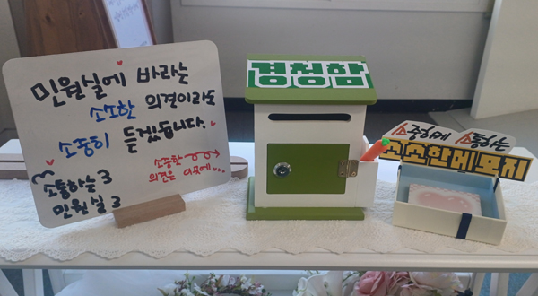 À̹ø¿¡ ¼³Ä¡µÈ `±¸¹Î °æÃ»ÇÔ`Àº ¹Î¿ø½ÇÀ» ãÀº ±¸¹ÎµéÀÌ ÀÏ»ó ¼Ó »ý°¢À̳ª ¼Ò¼ÒÇÑ ÀǰßÀ» ºÎ´ã ¾øÀÌ ³²±æ ¼ö ÀÖµµ·Ï ¸¶·ÃµÈ ¼ÒÅë °ø°£ÀÌ´Ù. À̸¦ ÅëÇØ ±¸¹Î ´©±¸³ª Æí¾ÈÇÑ ¸¶À½À¸·Î ÀÚ½ÅÀÇ À̾߱⸦ ÀüÇϰí, ÇàÁ¤°ú ÀÚ¿¬½º·´°Ô ¼ÒÅëÇÒ ¼ö ÀÖ´Â ºÐÀ§±â¸¦ Á¶¼ºÇÏ´Â µ¥ Àǹ̸¦ µÎ°í ÀÖ´Ù.