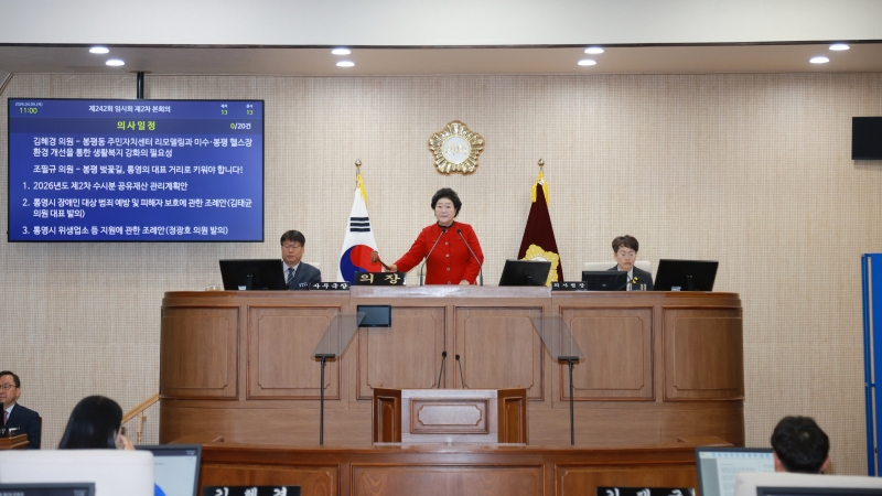 Áö³ 9ÀÏ Á¦2Â÷ º»È¸ÀÇ¿¡¼´Â °¢ ¼Ò°ü À§¿øÈ¸º° ½É»ç°á°ú º¸°í¸¦ µè°í ½ÉÀǤýÀǰáÇÑ °á°ú `Å뿵½Ã ½ÅºÀ ÇØ¾ç·¹Àú Áö¿ø½Ã¼³ °ü¸® ¹× ¿î¿µ Á¶·Ê¾È`, `Å뿵½Ã ¹®Çлó ¿î¿µ Á¶·Ê ÀϺΰ³Á¤Á¶·Ê¾È`Àº ¼öÁ¤°¡°áÇßÀ¸¸ç, `Å뿵½Ã Àå¾ÖÀÎ ´ë»ó ¹üÁË ÇÇÇØ ¿¹¹æ ¹× ÇÇÇØÀÚ º¸È£¿¡ °üÇÑ Á¶·Ê¾È(±èÅÂ±Õ ÀÇ¿ø ´ëÇ¥¹ßÀÇ)`¤ý`Å뿵½Ã À§»ý¾÷¼Ò µî Áö¿ø¿¡ °üÇÑ Á¶·Ê¾È(Á¤±¤È£ ÀÇ¿ø ¹ßÀÇ)`¤ý`Å뿵½Ã ¿©°´¼± ¹× µµ¼± ÀÌ¿ë ¼¶ ÁֹΠ¼÷¹Úºñ Áö¿ø¿¡ °üÇÑ Á¶·Ê¾È(±èÇý°æ ÀÇ¿ø ¹ßÀÇ)` ÀÌ»ó 3°ÇÀÇ ÀÇ¿ø¹ßÀÇÁ¶·Ê¾È°ú ÁýÇàºÎ¿¡¼ Á¦ÃâÇÑ `2026³âµµ Á¦1ȸ Ãß°¡°æÁ¤¿¹»ê¾È`, `2026³âµµ Á¦2Â÷ ¼ö½ÃºÐ °øÀ¯Àç»ê °ü¸®°èȹ¾È` µî 17°ÇÀÇ ¾È°ÇÀº ¿ø¾È´ë·Î °¡°á¤ýäÅÃÇϸç Á¦9´ë Å뿵½ÃÀÇȸÀÇ ¸¶Áö¸· °ø½Ä ÀÇ»çÀÏÁ¤À» ¸ðµÎ ¸¶¹«¸®Çß´Ù.