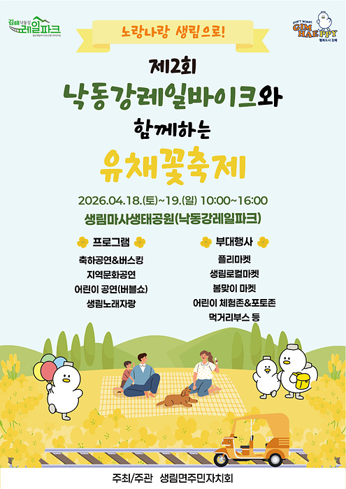 º»°ÝÀûÀÎ º½ ³ªµéÀÌöÀ» ¸Â¾Æ ±èÇØ½Ã ´ëÇ¥ °ü±¤ÁöÀÎ ³«µ¿°·¹ÀϹÙÀÌÅ©¿Í ¿¬°èÇÑ À̹ø ÃàÁ¦´Â `³ë¶û³ª¶û »ý¸²À¸·Î`¶ó´Â ½½·Î°ÇÀ» ÁÖÁ¦·Î ³ë¶õºûÀ¸·Î ¹°µç ¾Æ¸§´Ù¿î º½Ç³°æ°ú ÇÔ²² Áö¿ª¹®È°ø¿¬°ú ´Ùä·Î¿î üÇè ÇÁ·Î±×·¥ÀÌ ÁغñµÅ ÀÖ´Ù.
