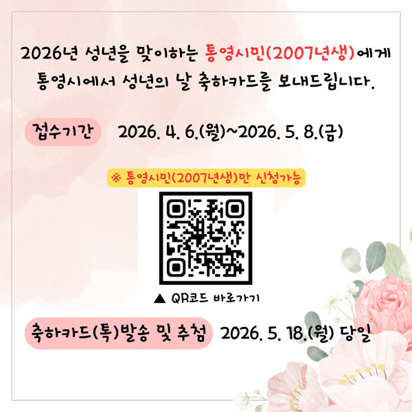 ¼º³âÀÇ ³¯ À̺¥Æ®´Â Áö³ 6ÀϺÎÅÍ ¿À´Â 5¿ù 8ÀϱîÁö Å뿵½Ã ȨÆäÀÌÁö, ³×À̹ö ºí·Î±×, ÀνºÅ¸±×·¥ µî Å뿵½Ã °ø½Ä SNS¿¡ °ÔÀçµÈ QRÄÚµå(³×À̹öÆû)À» ÅëÇØ Âü¿©ÇÒ ¼ö ÀÖ´Ù.