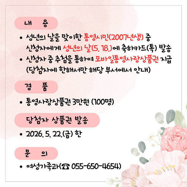 À̹ø À̺¥Æ®´Â ¿ÃÇØ ¼º³âÀÌ µÇ´Â 2007³â»ýÀ» ÃàÇÏÇϱâ À§ÇØ À̺¥Æ® Âü¿©ÀÚ¿¡°Ô ¼º³â ÃàÇÏÄ«µå(¿Â¶óÀÎ)¸¦ ¹ß¼ÛÇϰí, ±× Áß Ãß÷À» ÅëÇØ 100¸í¿¡°Ô ¸ð¹ÙÀÏ Å뿵»ç¶û»óǰ±Ç(3¸¸¿ø±Ç)À» Áö±ÞÇÑ´Ù.