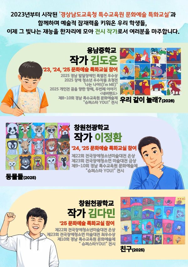 Âü¿© ÀÛ°¡µéÀÇ À̷µµ ´Ùä·Ó´Ù. ¡ã¿ë³²Áß ±èµµÀº(2Çгâ) ÇлýÀº 2023³âºÎÅÍ ÀڽŸ¸ÀÇ ¼±°ú »öÀ¸·Î °¨Á¤À» Ç¥ÇöÇØ ¿ÔÀ¸¸ç, 2025³â °æ³² ¹ß´ÞÀå¾ÖÀΠƯº°Àü¿¡¼ ¿ì¼ö»óÀ» ¹Þ¾Ò´Ù. ¡ãâ¿øÃµ±¤Çб³ ÀÌÁ¤È¯(2Çгâ) ÇлýÀº Àü±¹Àå¾Öû¼Ò³â¹Ì¼ú´ëÀü¿¡¼ ±Ý»ó°ú Àº»óÀ», ¡ã±è´Ù¹Î(3Çгâ) Çлý ¿ª½Ã °°Àº ´ëȸ¿¡¼ ÃÖ¿ì¼ö»ó°ú Àº»óÀ» ¼ö»óÇÏ¸ç ´ë¿ÜÀûÀ¸·Îµµ ¶Ù¾î³ ¿¹¼úÀû ¿ª·®À» ÀÎÁ¤¹Þ¾Ò´Ù.