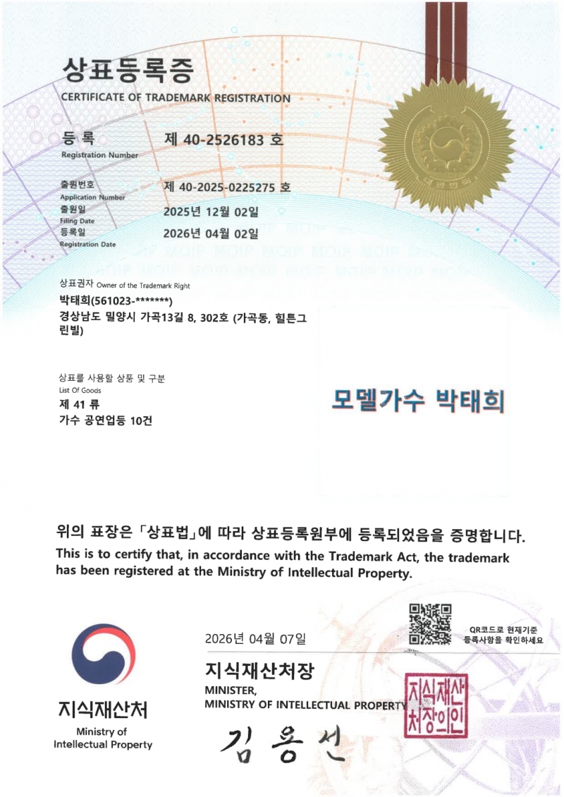¹Ð¾ç Ãâ½Å ¹ÚÅÂÈñ°¡ Áö³ 7ÀÏ Áö½ÄÀç»êó·ÎºÎÅÍ `¸ðµ¨°¡¼ö ¹ÚÅÂÈñ`¶ó´Â »óÇ¥µî·ÏÁõÀ» ¹Þ¾Ò´Ù.