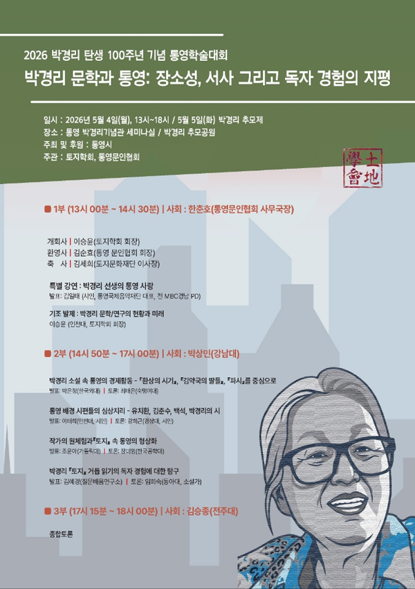 Å뿵½Ã´Â Çѱ¹ ¹®ÇÐÀÇ °Å¸ñ ¹Ú°æ¸® ¼±»ý ź»ý 100ÁÖ³âÀ» ¸Â¾Æ ¿À´Â 5¿ù 4ÀÏ ¿ÀÈÄ 1½Ã ¹Ú°æ¸®±â³ä°ü ¼¼¹Ì³ª½Ç¿¡¼ Å뿵¹®ÀÎÇùȸ¿Í ÅäÁöÇÐȸ°¡ °øµ¿ ÁÖ°üÇÏ´Â `2026 ¹Ú°æ¸® ź»ý 100Áֳ⠱â³ä Å뿵Çмú´ëȸ`¸¦ °³ÃÖÇÑ´Ù.