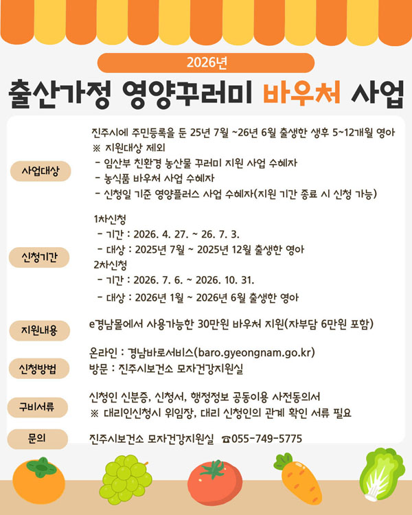 ÁøÁֽú¸°Ç¼Ò´Â Ãâ»ê °¡Á¤ÀÇ °æÁ¦Àû ºÎ´ãÀ» ´ú°í ¿µ¾ÆÀÇ °Ç°ÇÑ ¼ºÀå°ú ¹ß´ÞÀ» Áö¿øÇϱâ À§ÇØ 2026³â ½Å±Ô»ç¾÷ÀÎ `Ãâ»ê°¡Á¤ ¿µ¾ç²Ù·¯¹Ì ¹Ù¿ìó(Voucher) Áö¿ø»ç¾÷`À» 27ÀϺÎÅÍ ½ÃÇàÇÑ´Ù°í ¹àÇû´Ù.